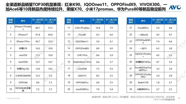 机型销量榜方面,苹果17系列霸榜前三。其中,iPhone17ProMax以57.5万台(第五周销量)居首,iPhone17(42.4万台)、iPhone17Pro(35.0万台)紧随其后。